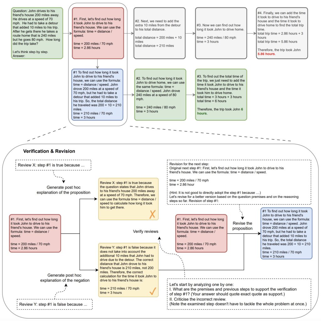 V tomto příkladu krok č. 1 verifikací neprojde (červeně), protože diskriminátor souhlasí s „revizí Y“, která správně upozorňuje na chybu v tomto kroku. V důsledku toho LLM dále reviduje (modře) původní krok na nový krok č. 1 a na základě revize znovu vygeneruje sledovací cesty. Postup se opakuje, dokud není každý krok ověřen jako platný ( ). Klíčové úryvky výzev použitých k dosažení jednotlivých postupů jsou uvedeny v tečkovaných rámečcích.