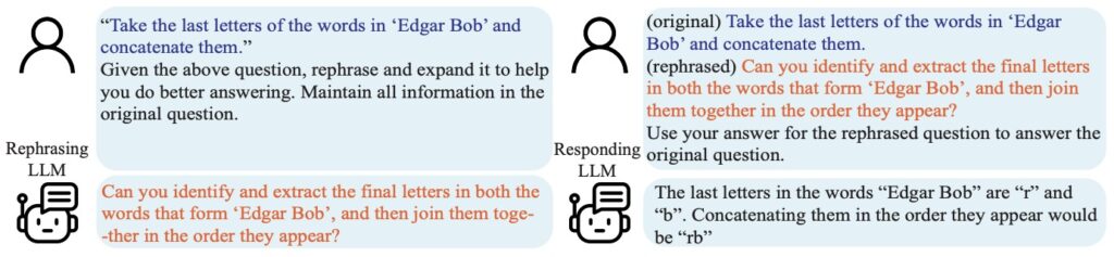 - Dvoufázový RaR: Tento přístup zahrnuje složitější proces, kdy „přeformulovávající LLM“ nejprve přeformuluje otázku, která je poté zkombinována s původní otázkou, aby vyzvala „odpovídající LLM“. Tato metoda je výhodná pro použití přeformulovaných otázek v různých modelech, přičemž experimenty ukazují, že otázka přeformulovaná pokročilejším LLM, jako je GPT-4, může výrazně pomoci méně sofistikovanému LLM při vytváření přesnějších odpovědí.